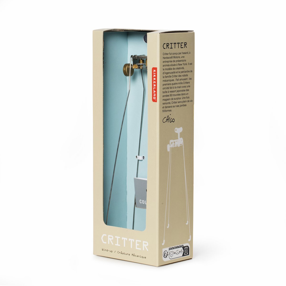 Critter wurde zufällig im Studio einer Motion-Display-Firma namens Hankscraft Motors in NYC konzipiert. Es hat einen Paten namens David Dear, den Schöpfer des fabelhaften Duck Mirror, des Rainbow Maker und vieler anderer erstaunlicher Produkte. Die ersten viertausend Critters wurden von Hand gefertigt, wobei ein japanisches Vintage-Getriebe aus den 1950er Jahren verwendet wurde, das in einem Restpostengeschäft gefunden wurde. Der erste Laden, der Critter verkaufte, heißt Mxyplyzyk. Zwischen Hankscraft, Mxyplyzyk und Kikkerland können Sie also eine Vorstellung davon bekommen, womit wir es hier zu tun haben. Im Wesentlichen folgt ein No-Form-Objekt keiner Funktion.