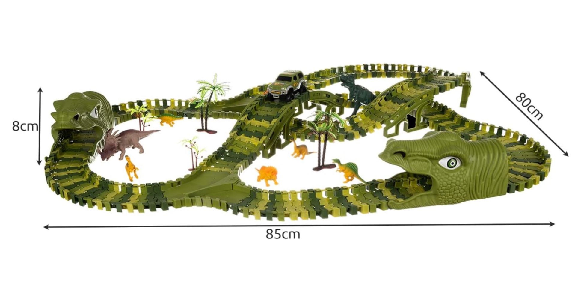 XXL Set - es besteht aus 240 Strecken- und Parkelementen, die das Spiel attraktiver machen und es ermöglichen, eine große Strecke mit interessanten Spielabschnitten und einer Landschaft zu bauen, die der realen Welt der prähistorischen Dinosaurier ähnelt. Die Teile der Bahn lassen sich schnell und einfach miteinander verbinden, und dank der Verbindungsstellen bleibt die Konstruktion stabil, aber auch flexibel beim Spielen.